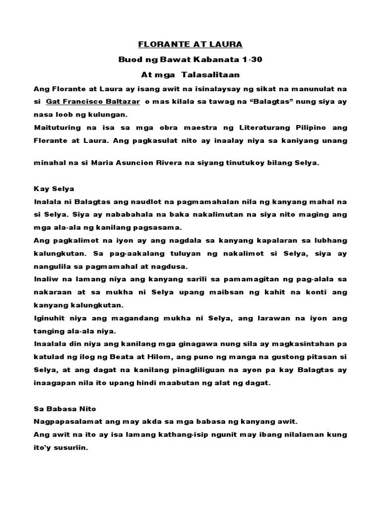 Online Library Florante At Laura Florante at Laura Buod Buod ng Florante at Laura Ang kuwento ng Florante at Laura ay nagsisimula sa isang madilim na gubat sa may dakong labas ng bayang Albanya malapit sa ilog Kositong na ang tubig ay makamandag. Ibinahagi ni Francisco ang lahat ng kanilang masasayang nangyari sa buhay nila ni Selya. Itoy tungkol sa unang pag-ibig ng may-akda na si Francisco Balagtas Baltazar kay Maria Asuncion Rivera na tinawag niyang Selya.