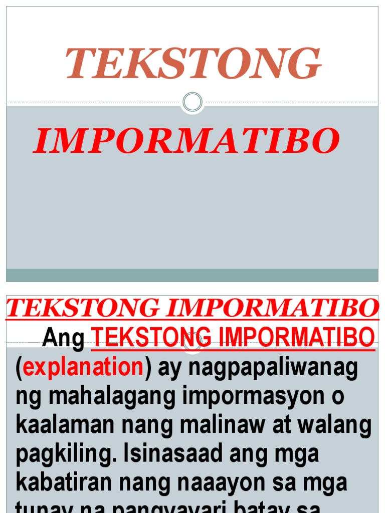 Naglalayon itong magbigay ng impormasyon o magpaliwanag nang malinaw at walang pagkiling tungkol sa ibat ibang paksa. Ito ang uri ng tekstong impormatibong nagbibigay paliwanag kung paano o bakit naganap ang isang bagay o pangyayari. Tekstong Impormatibo Ay isang na nagpapahayag na naglalayong magpaliwanag at magbigay ng impormasyon at mahalagang detalye ng may lohikal na paghahanay.