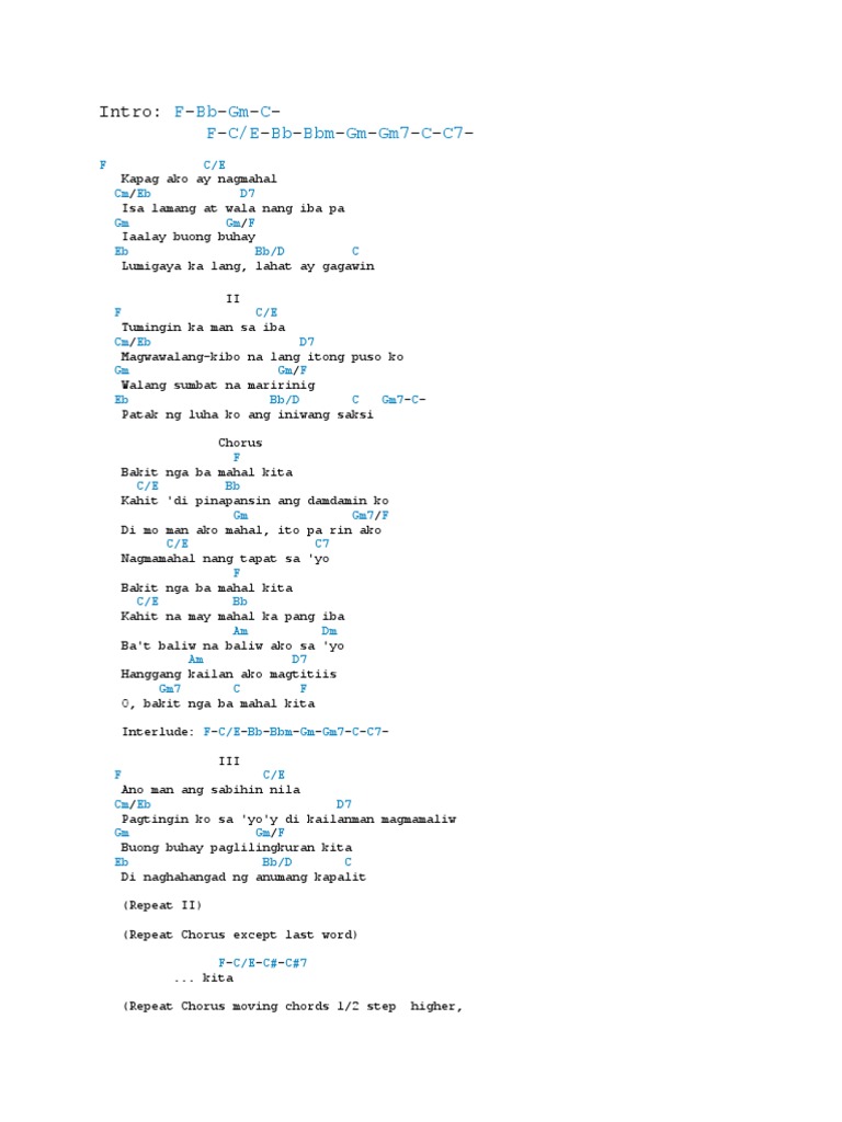Gm Di mo man ako mahal ito pa rin ako C D Nagmamahal nang tapat sa yo G Bakit. A - AG - DF - E - A AG Parang kahapon lang D A Nang tayoy nag-simula A AG D A Minamahal kitat mahal mo rin ako Fm E Ngunit bakit parang ikaw ay nagbago Fm E D D E D A Wala naman akong pagkukulang sa yo Chorus A Mahal mo pa ba kaya ako Cm Tanong ng puso ko Bm Kailangan mo pa kaya ako Dm E Dyan sa piling. G Dalawa kayo sa buhay ko D Em At ako ngayon ay kailangan nang mamili C Isa lang ang maaari G Alam mong narito ako D Lagi para sa iyo Em Mahal kita ng labis C Ngunit iba ang iyong nais Refrain.