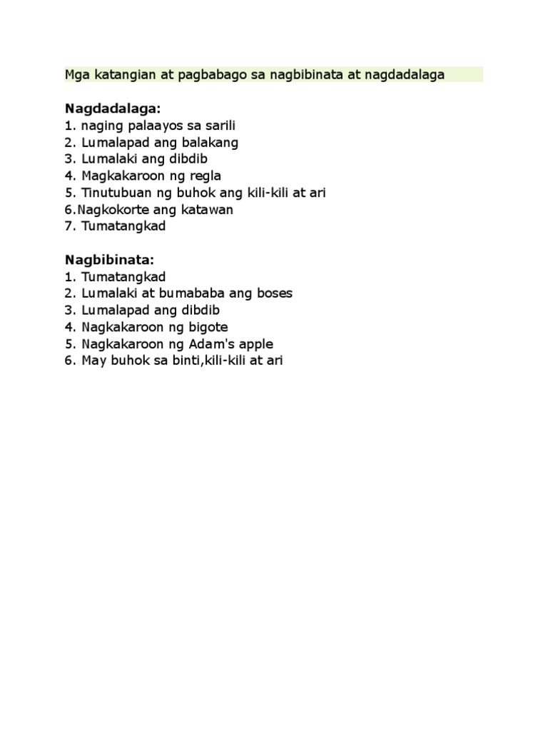 Mga Katangian At Pagbabago Sa Nagbibinata At Nagdadalaga Pdf