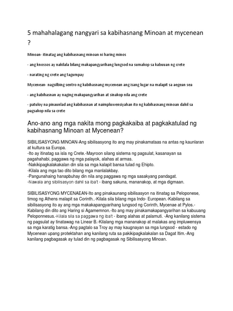 Ano Ang Mga Katangian Ng Kabihasnang Minoan At Mycenaean At Greek